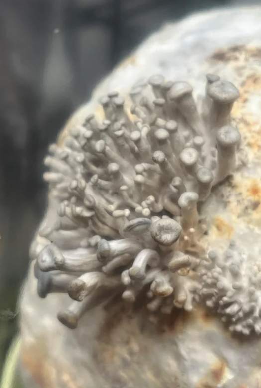 Behold, the first signs of life! At this stage the mushroom needs the most moisture and is at high risk of drying out. These mushrooms will likely mature in 3-7 days.